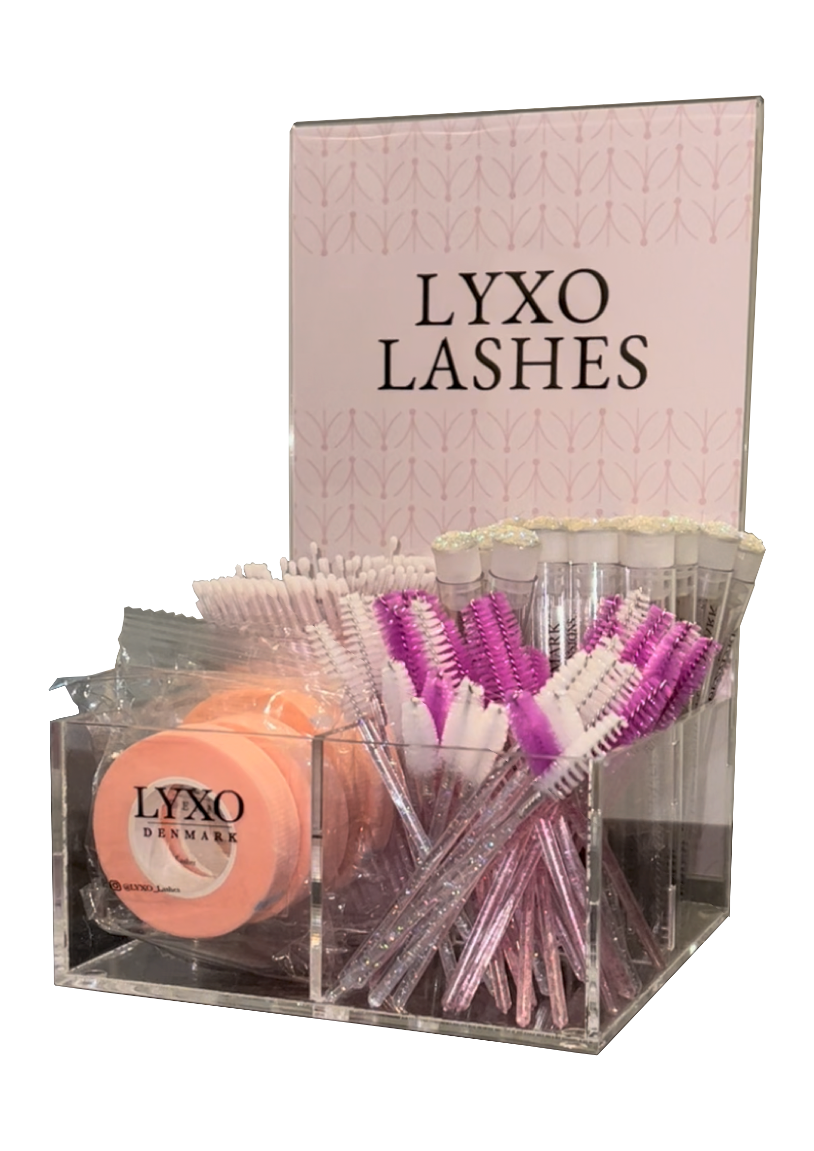 Display for eyelash extension products. The rear cover can be removed, so that it is only the 4 storage compartments. Cardboard with logo and print can be removed and replaced with your own personal logo.