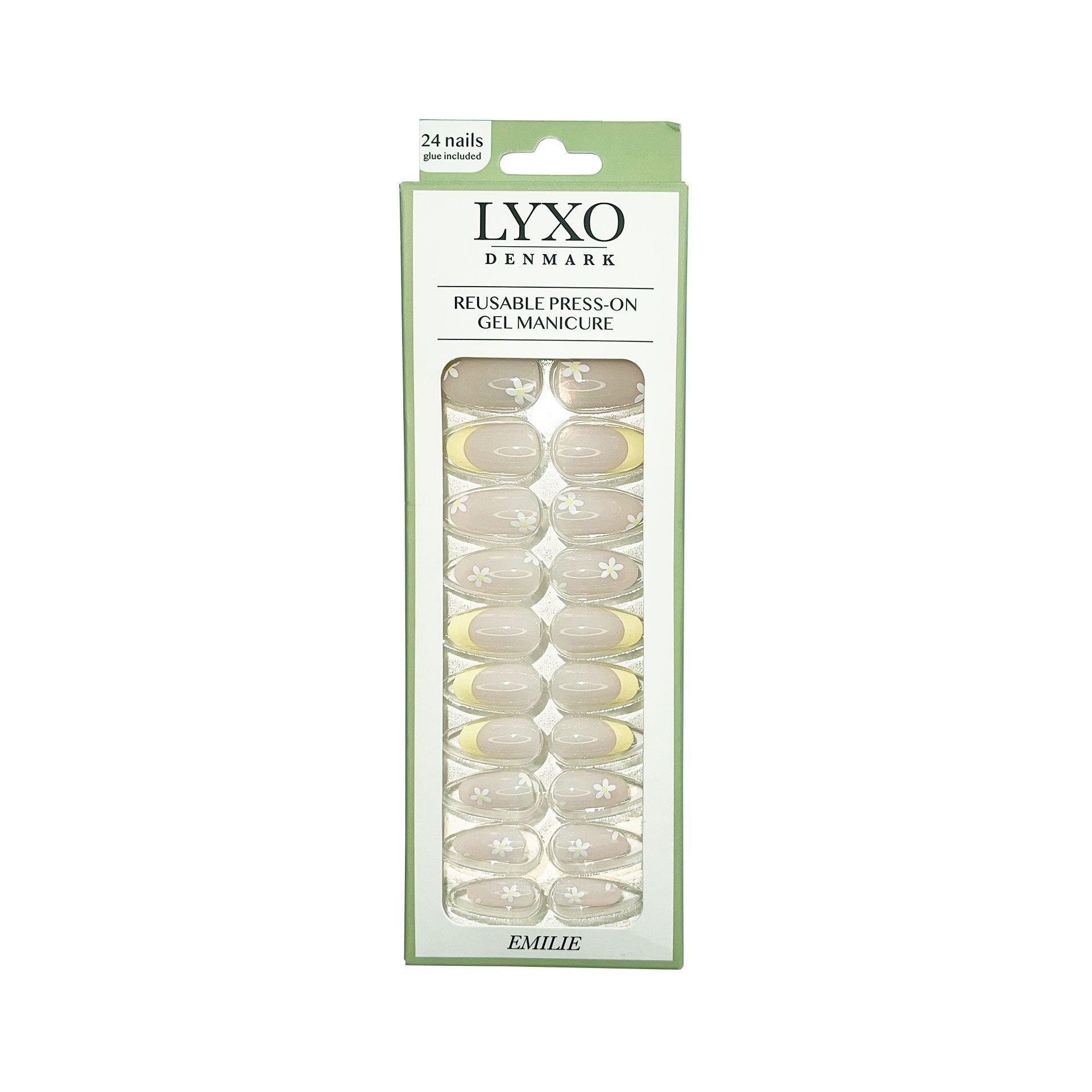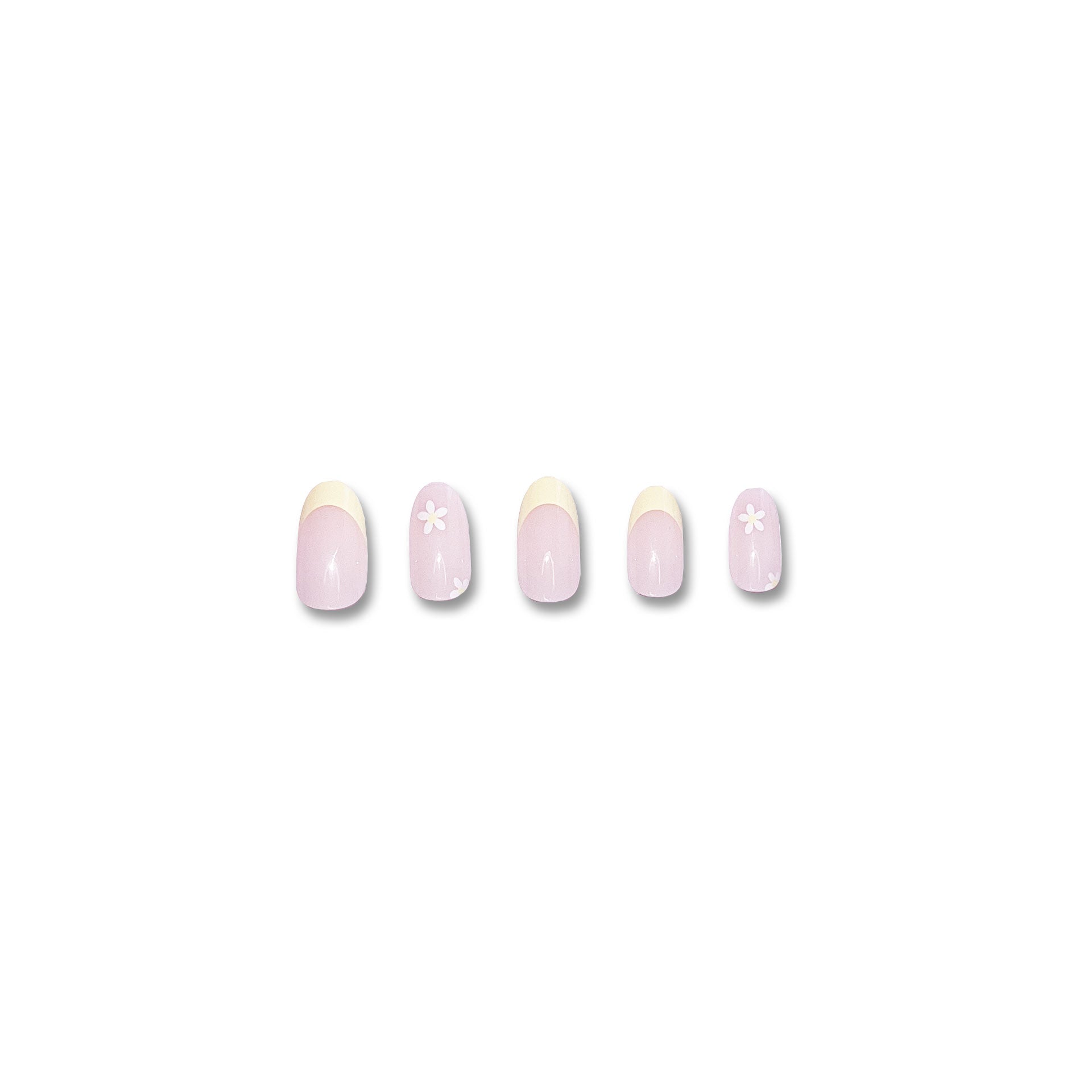 Emilie's press-on gel manicure is almond-shaped nails with yellow French tips and t unadorned flowers.