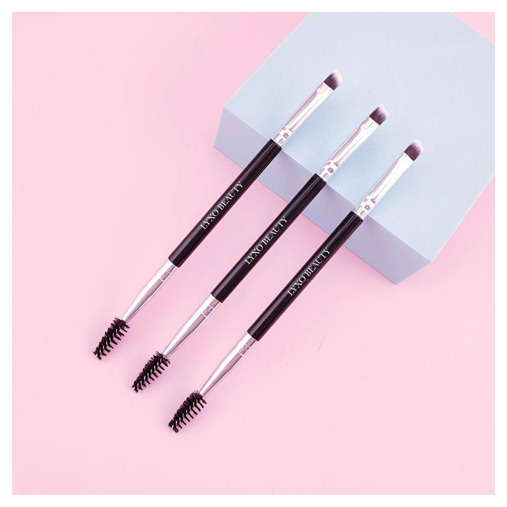 Brow brush with two ends: an angled brush for applying product and a brush for combing the hairs.